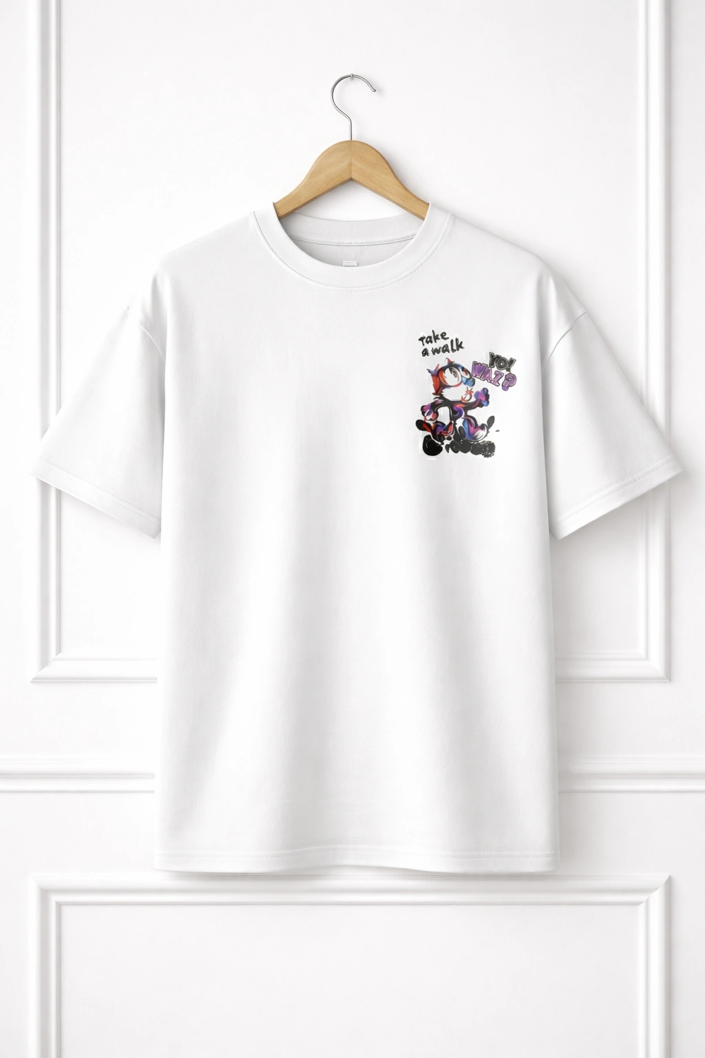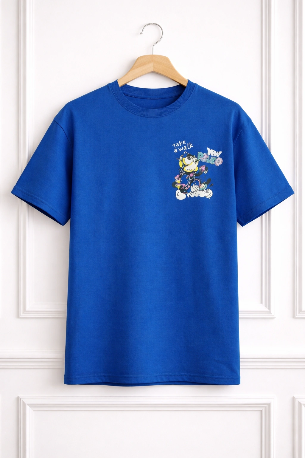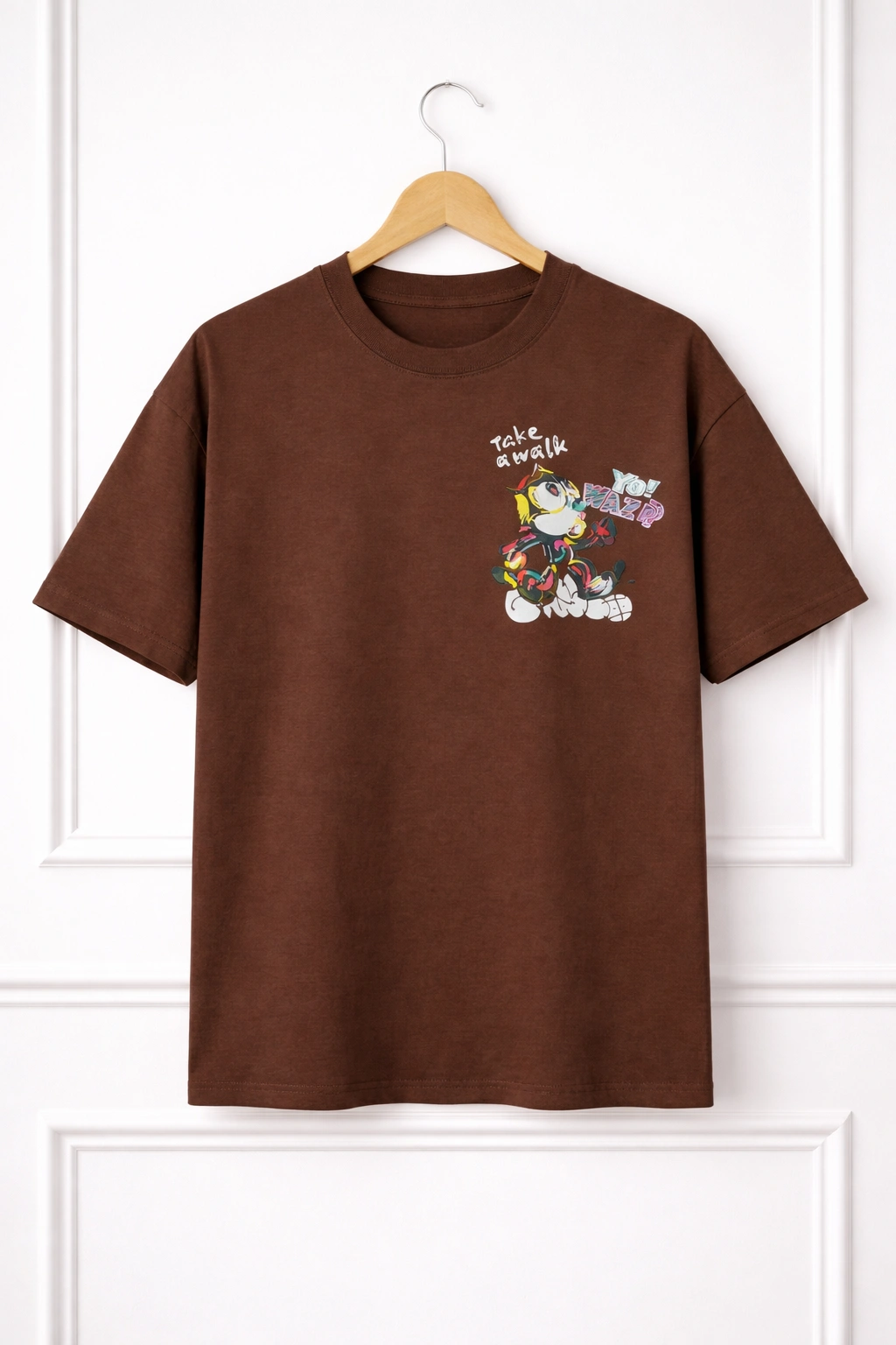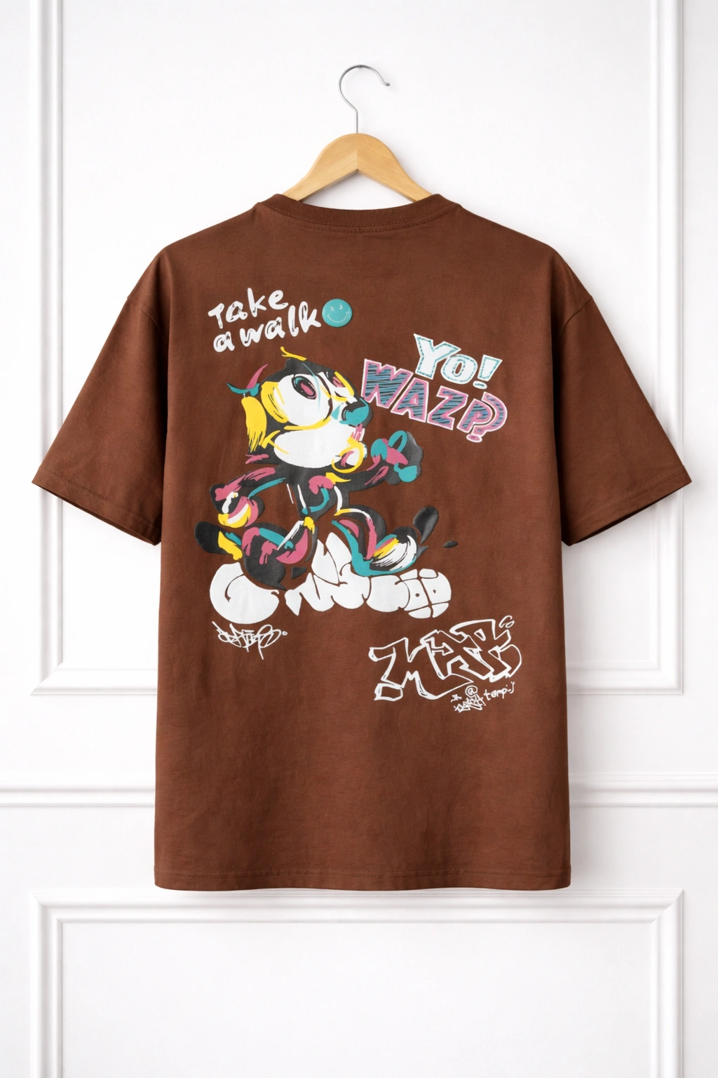 Turn around, and you will rock a bold, oversized retro mascot design. Truly, this is not just a print; it is a statement. The back graphic of this T-Shirt draws heavy inspiration from 90s skate culture. Additionally, it highlights underground street art and vintage cartoon mascots. The interplay of vibrant colors against the premium cotton base creates a visual pop that immediately commands attention. Meanwhile, the character design remains chaotic yet cohesive. Ultimately, it perfectly captures the restless, creative energy of today’s youth fashion scene.