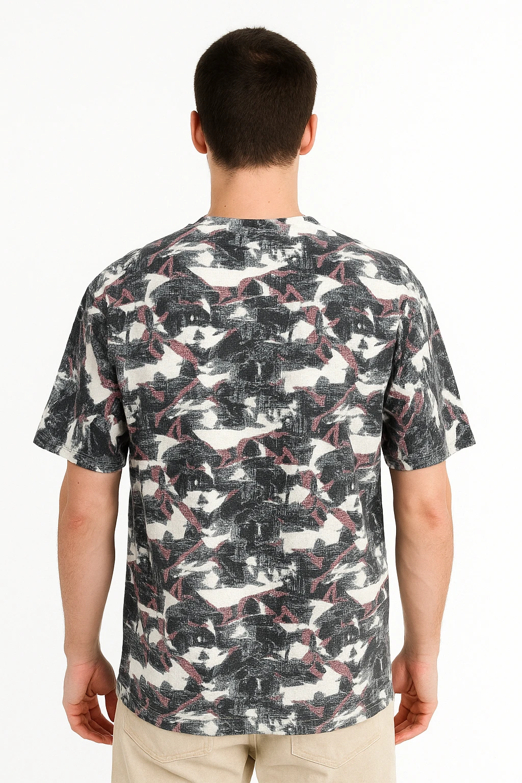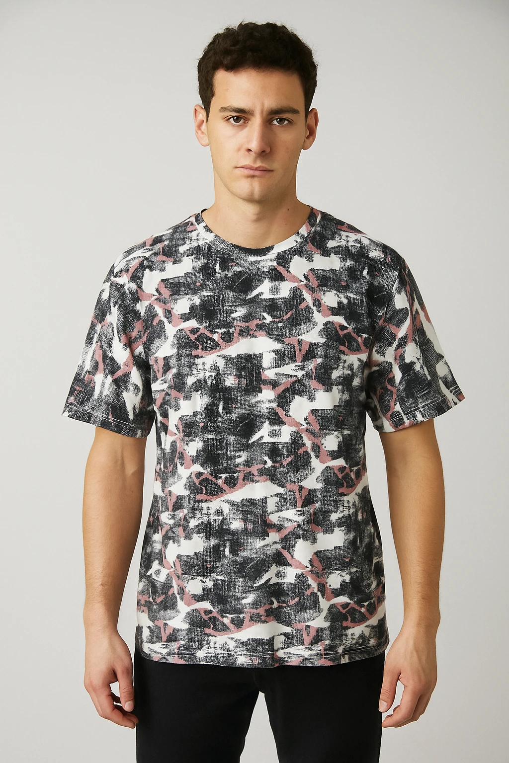 Step into bold streetwear style with the Urban Abstract Print Crew Neck T-Shirt. Featuring a striking blend of black, white, and dusty pink brushstroke patterns, this tee is designed for those who embrace individuality. Made from soft, breathable cotton, it keeps you comfortable while making a statement. Perfect for pairing with jeans, joggers, or shorts, this shirt brings an instant edge to your casual wardrobe.